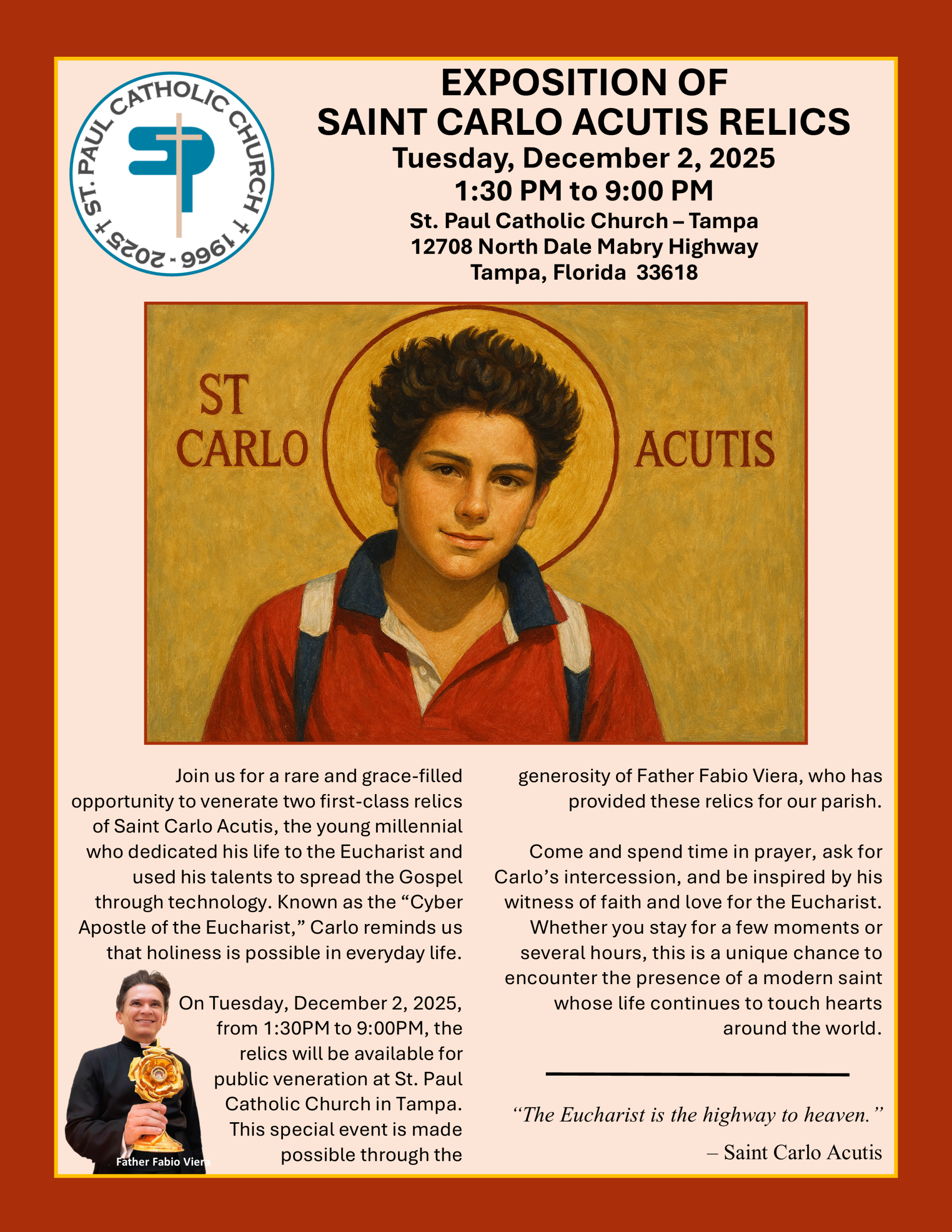 December 2:  Exposition of the First-Class Relics of St. Carlo Acutis, 1:30pm – 9:00pm, Main Church [CLICK HERE FOR MORE INFO]