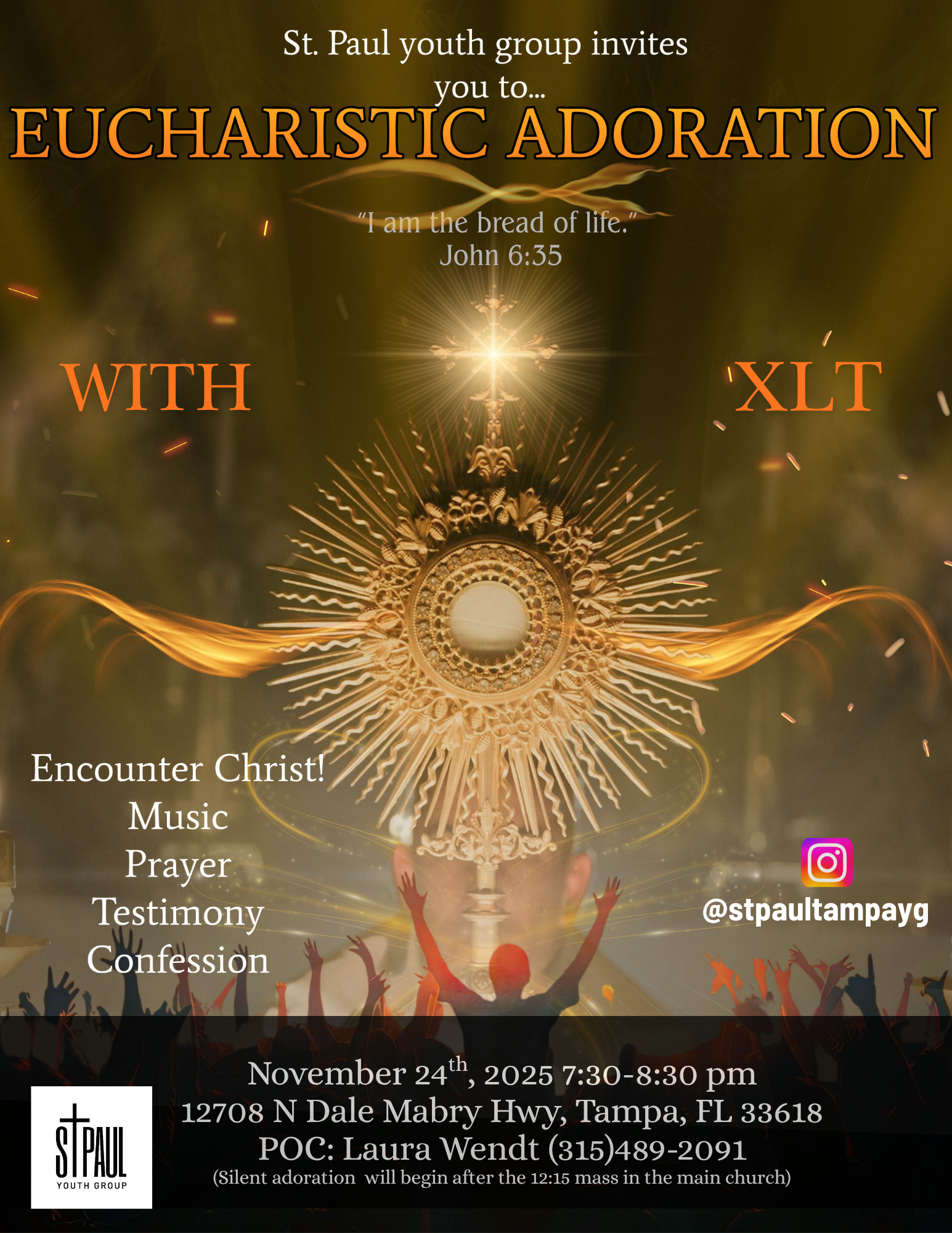 November 24: Eucharistic Adoration with XLT, 7:30pm – 8:30pm, Main Church [CLICK HERE FOR MORE INFO]