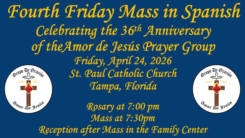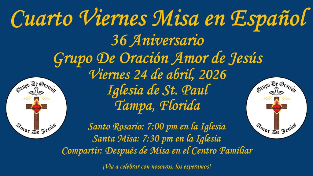 Join us on Friday, April 24th, for the Fourth Friday Mass in Spanish and the celebration of the 36th Anniversary of the Amor de Jesus Prayer Group! We will begin the evening at 7:00pm in the main church with the recitation of the Holy Rosary. At 7:30pm, Mass will be celebrated in the Spanish language. After the Mass, a reception will be held in the Family Center. All are welcome!