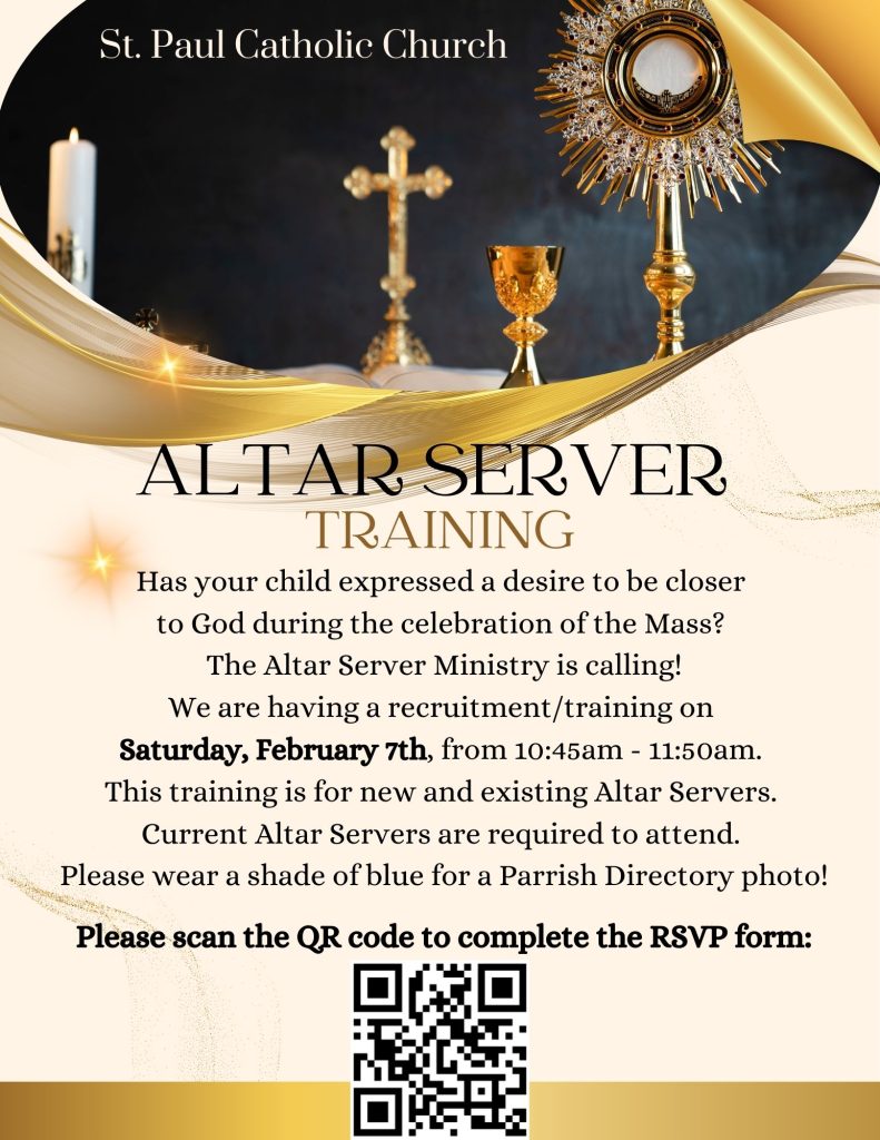 We are having a recruitment/training on Saturday, February 7, 2026, from 10:45am – 11:50am. This training is for new and existing Altar Servers. Current Altar Servers are required to attend. Please wear a shade of blue for a Parrish Directory photo!