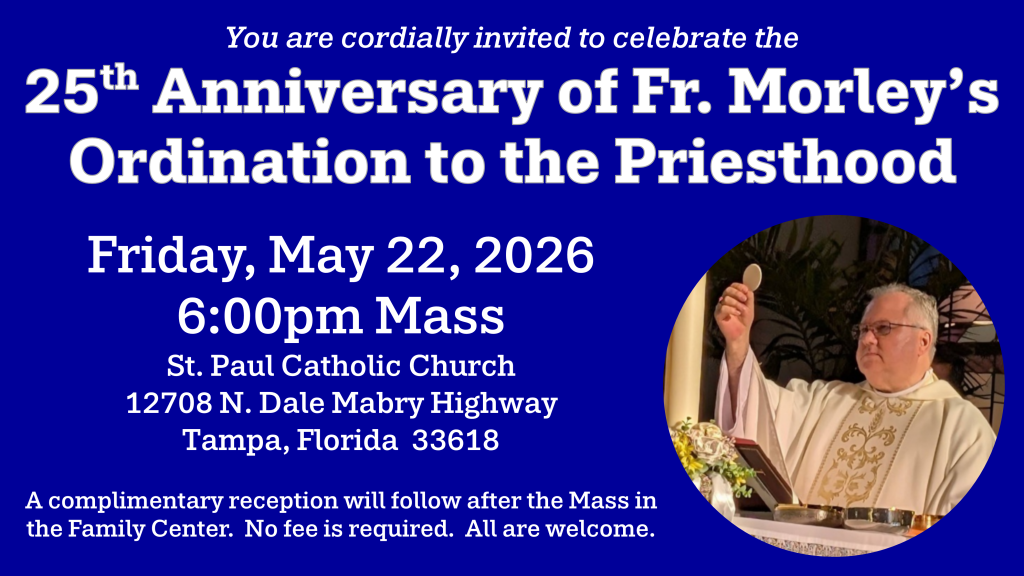 Please join us as we joyfully celebrate the 25th Anniversary of Fr. Morley’s Ordination to the Priesthood. This special occasion is an opportunity for our parish community, friends, and family to come together in gratitude and prayer for Fr. Morley’s years of faithful service.