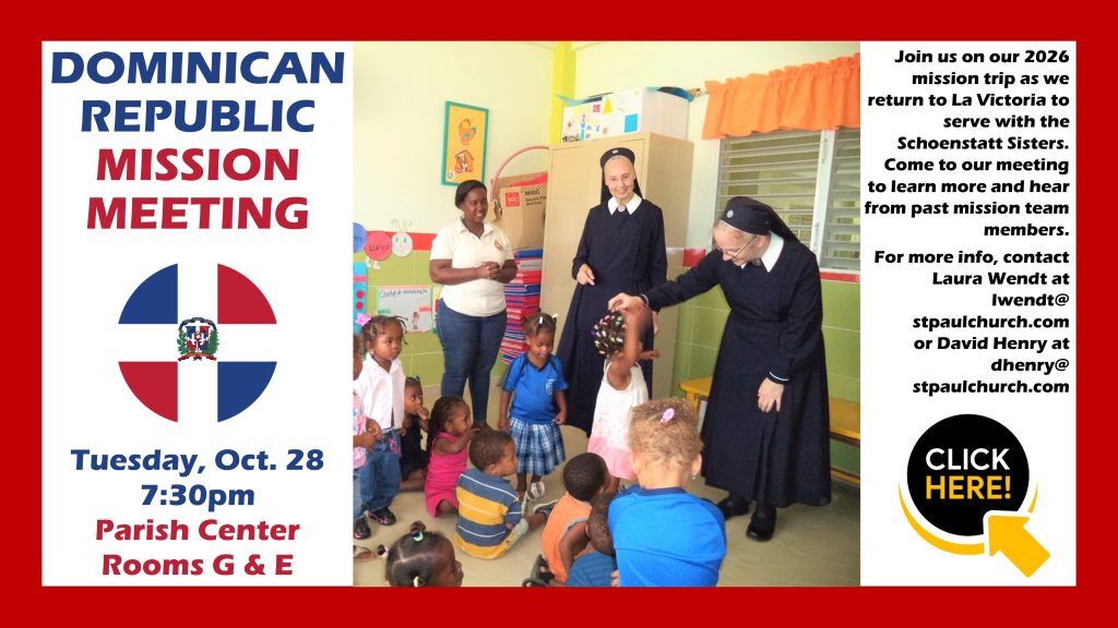 Have you ever felt called to serve beyond your community? Come learn about St. Paul Catholic Church’s 2026 Mission Trip to the Dominican Republic! Join us Tuesday, October 28 at 7:30pm in Parish Center Rooms G & E to hear how we’ll serve alongside the Schoenstatt Sisters in La Victoria. Meet past mission team members, ask questions, and see how this experience of faith, compassion, and service could change lives — including your own.
