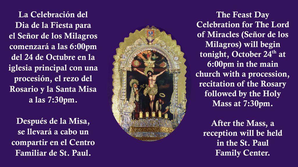 The Feast Day Celebration for The Lord of Miracles (Señor de los Milagros) will begin tonight, October 24th at 6:00pm in the main church with a procession, recitation of the Rosary followed by the Holy Mass at 7:30pm.