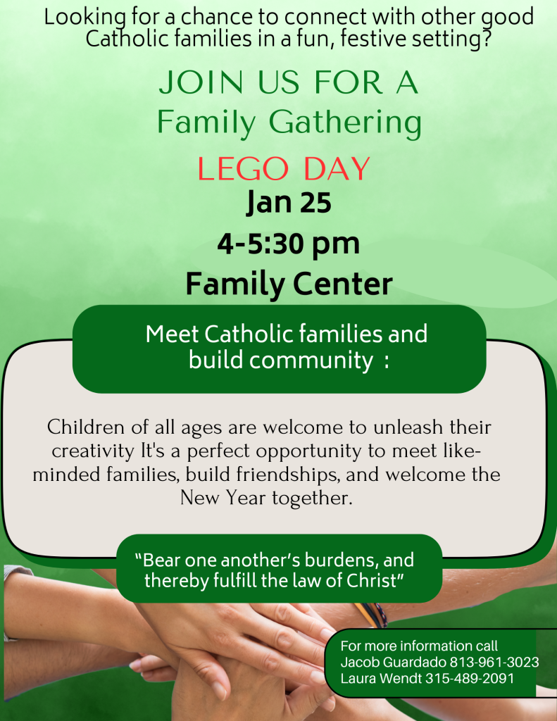 The theme for this event will be “Lego Day”. Children of all ages are welcome to unleash their creativity! The gathering will be a great opportunity to meet other parish families, build friendships and welcome in the new year together.