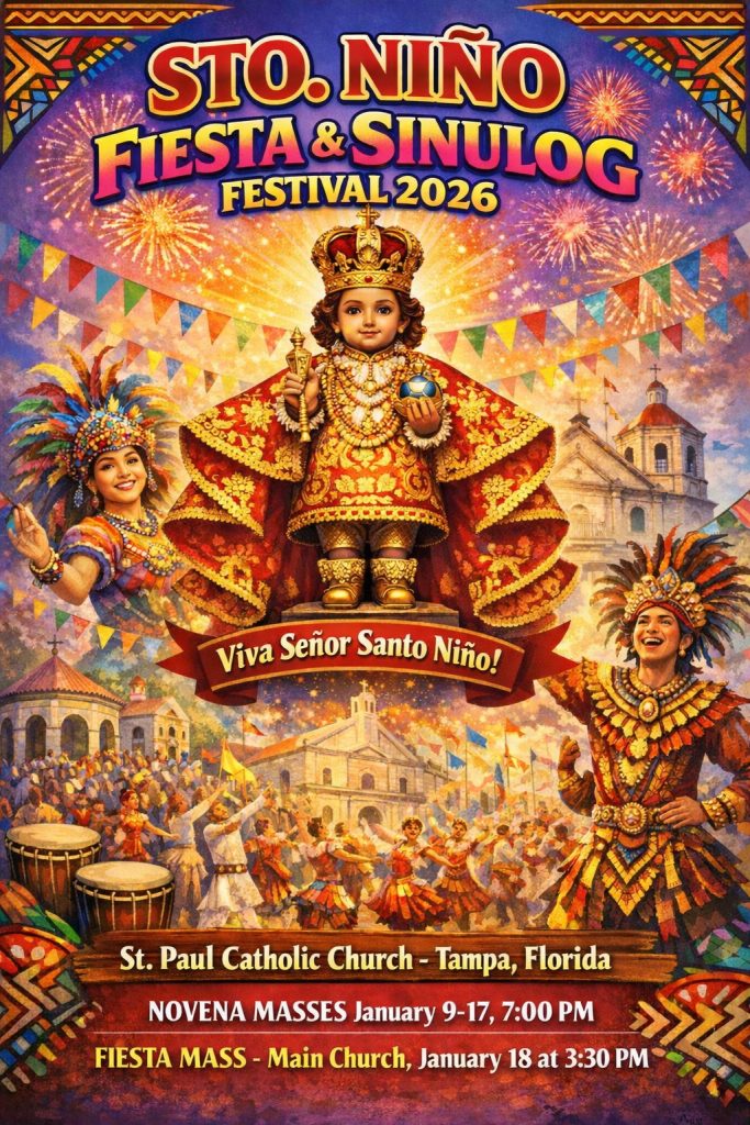 The Annual Santo Nino Novena of Masses will begin on Friday, January 9th and will be held through Saturday, January 17th every night at 7:00pm in the Main Church (except for January 10th in the Family Center). The Fiesta Mass will be held on Sunday, January 18th at 3:30pm in the Main Church followed by a reception and Sinulog in the Family Center after the Mass. All are welcome!