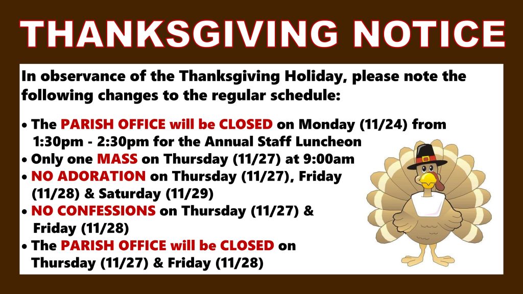 The PARISH OFFICE will be CLOSED on Monday (11/24) from 1:30pm – 2:30pm for the Annual Staff Luncheon