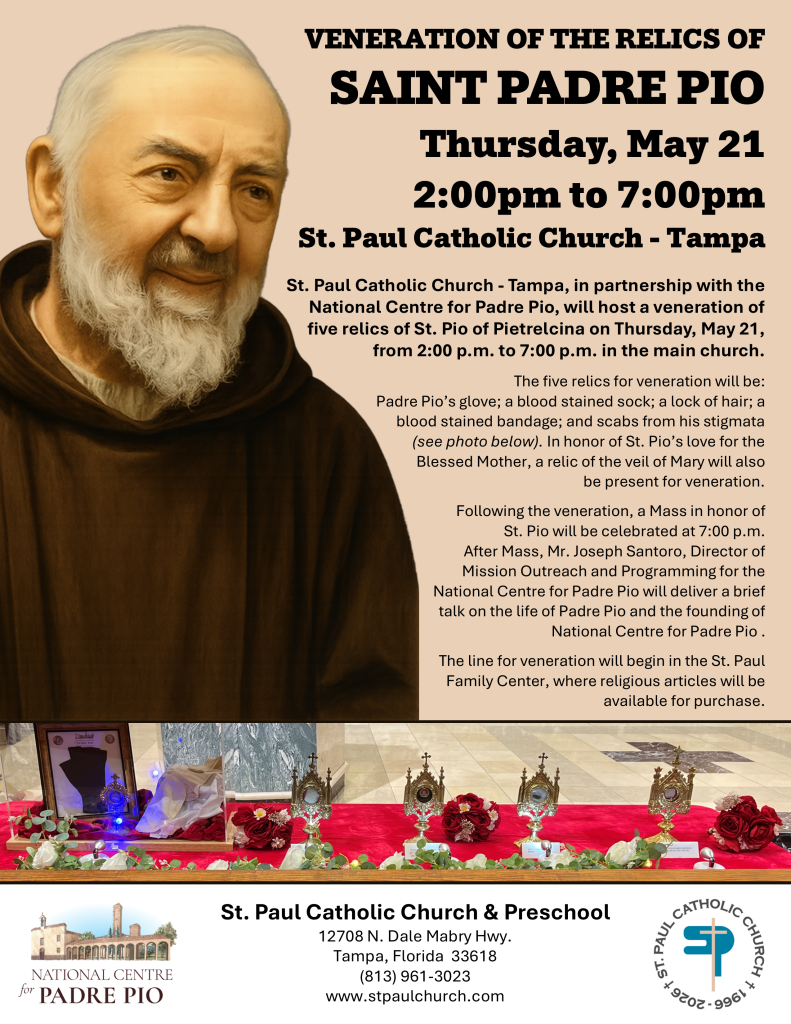 St. Paul Catholic Church – Tampa, in partnership with the National Centre for Padre Pio, will host a veneration of five relics of St. Pio of Pietrelcina on Thursday, May 21, from 2:00 p.m. to 7:00 p.m. in the main church.